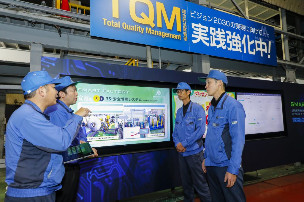 「松本工業スマートファクトリープロジェクト」では、工場内の「物流自動化」と「見える化」から着手した。AGVはキットのみ購入し、社内エンジニアが制御・棚・供給装置を設計、製作して、搬送システムとして組み上げた。センサーを設置し、プレス機の稼働などを常時監視。1日数百枚も必要だった紙の帳簿は、電子化しペーパーレス化を始めた。また、製造順序が複雑で熟練の作業者への依存が強い業務についてはAI を活用。顧客の需要に応じて、AI が計画立案を支援することにより、生産計画の立案に極力人手をかけないシステムが完成した。 品質管理では、不良品が出る要因が多岐にわたっていたが、原因究明には9秒に1個の割合での記録が必要で、人力では不可能だった。そこで「一個一個の製品に起こっていることを自動的に記録しよう」と、製造工程の追跡性を強化。非接触で情報を読みとる無線周波数識別(RFID)を採用した。それまでのやり方と異なる作り方には反発もあったが、現場の意見を細かく聞き取り、最終的に記録を取り込めるようになった。現在ではAIが設備を操作して不良品の発生を自動的に抑制する仕組みが試験稼働している。
